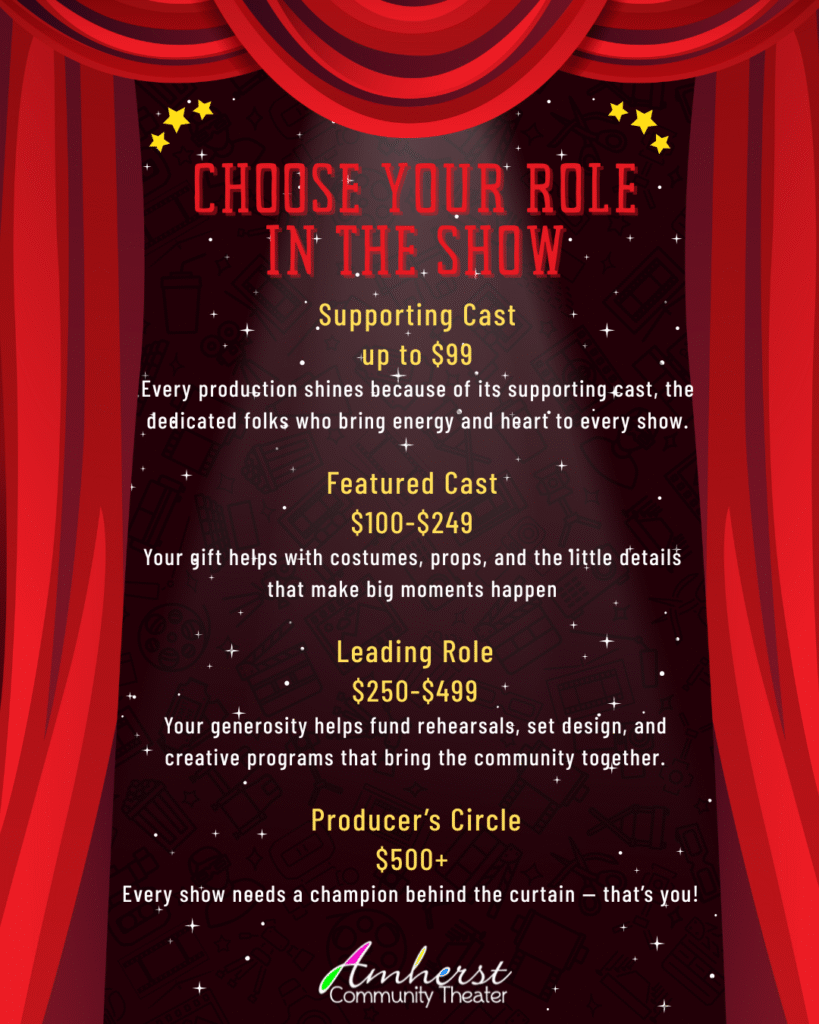 To continue producing high quality musical theater, Amherst Community Theater depends on generous financial contributions from the community.